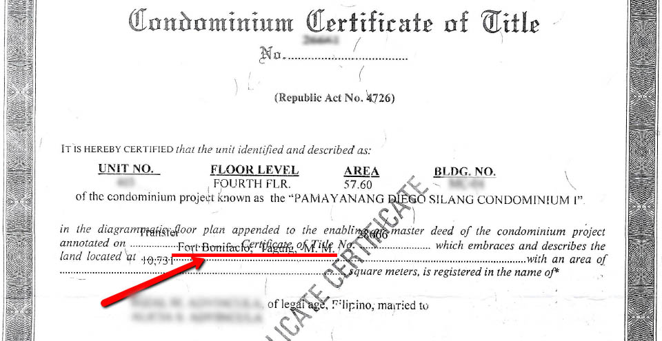 The above is a Condominium Certificate of Title. Note the location of this property which is in Fort Bonifacio, Taguig - a former military base. Therefore, to back trace the origin of this title will involve checking with the BCDA.